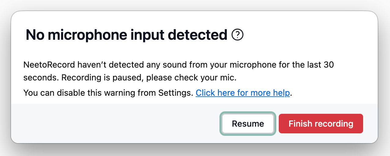 NeetoRecord show a warning if no audio is detected for 30 seconds while recording to the user.