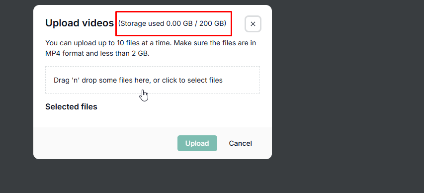 The amount of storage used out of the 200 GB limit will be shown next to the "Upload videos" text, in parentheses.
